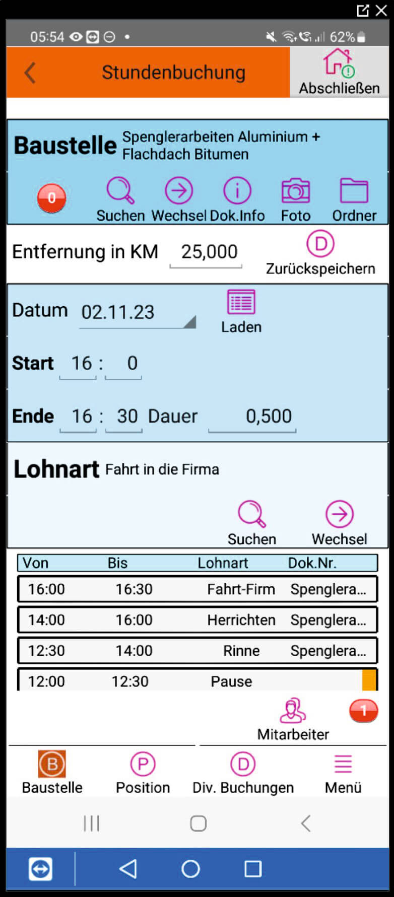 - Auswahl des Auftrages über Baustellen, Regie, Wartung oder alle Baustellen